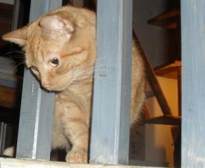 So lebt er da, aber glaubt nicht, dass er im Käfig sein muß. Der ist nämlich offen und darum schläft er auch immer in der blauen Hütte da neben dem Käfig. Oder er guckt aus dem Fenster.