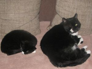 Kater Leila liegt auf Tiffy. So kann sie auch nicht wachsen.