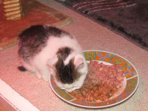 Und hier seht Ihr Leila. Dem geht´s jetzt richtig gut, hoffen wir. Das wird mal ein ganz großer, toller, stattlicher Kater. Sagt Mama. Und der frißt gerne Eintagsküken! Neulich gab es welche von Mama und der hat sich da drauf gestürzt und ganz laut geknurrt und alles aufgegessen. Da blieb nicht eine Kralle über. Tiffy war aber noch schlimmer. Die hat damit Fangen gespielt und das Küken überall rumgeworfen. Mama fand das nicht lustig und mußte weglaufen, weil ihr alles mögliche ans Bein gespritzt ist, sagt sie. Aber da sieht man, was Katzen wirklich wollen und brauchen. Sagt Mama auch. Die Großen, die müssen das erst wieder lernen, weil sie so lange die Büchsen essen mußten. Manche ekeln sich sogar vor sowas. Die Kleinen aber wissen sofort, was sie damit machen müssen, die finden das ganz toll, so´n Küken.