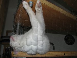 Lena liebt unsere Treppe und noch mehr das Katzennetz, mit der wir diese