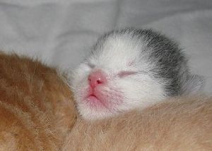 Da es meine erste Live - Geburt war, war ich natürlich auch ziemlich aufgeregt - ein so winziges, eben gerade geborenes Katzenbaby hatte ich vorher noch nie in der Hand. Meine Angst, dass Caro ihr Baby womöglich nicht annehmen könnte, war glücklicherweise umsonst. Nachdem ich die Fruchtblase entfernt hatte, damit dieser Winzling atmen konnte und ihr ihr Baby direkt vor die Nase legte, kümmerte sie sich sofort liebevoll um ihr Erstgeborenes.
